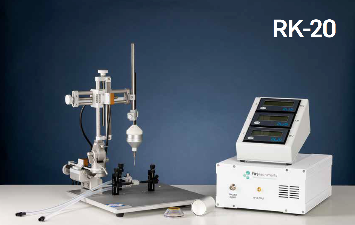 The RK-20 is a portable focused ultrasound system that integrates into a standard stereotactic frame. A single-element focused ultrasound transducer can be positioned to deliver energy to precise brain regions using stereotactic localization. The system comes with an optional hydrophone and digital receive electronics to monitor acoustic emissions from the brain. A compact RF generator can be controlled from any standard computer via USB using a graphical software interface. Customized acoustic exposures can be delivered from the transducer including continuous waves, bursts, and gated bursts studies. The RK-20 is used world-wide for investigations ranging from tissue ablation to blood-brain barrier opening and neuromodulation.