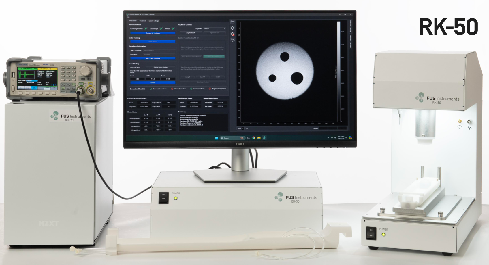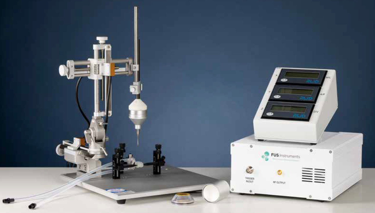 The RK-50 is a preclinical FUS system capable of delivering precise ultrasound exposures in the rodent brain. The system includes everything you need to start ultrasound brain studies out of the box. The arbitrary waveform generator allows the generation of precise waveforms and ensures synchronized operation. Targeting is achieved using a rodent digital brain atlas and stereotactic methods, or with MRI using a custom attachment. The 3-axis positioning system with the stereotactic frame ensures fast and precise multi-point targeting. The RK-50 uses real-time acoustic feedback with a built-in hydrophone to ensure rigorous and repeatable application. The system can be configured to work on a benchtop or on a laboratory cart.